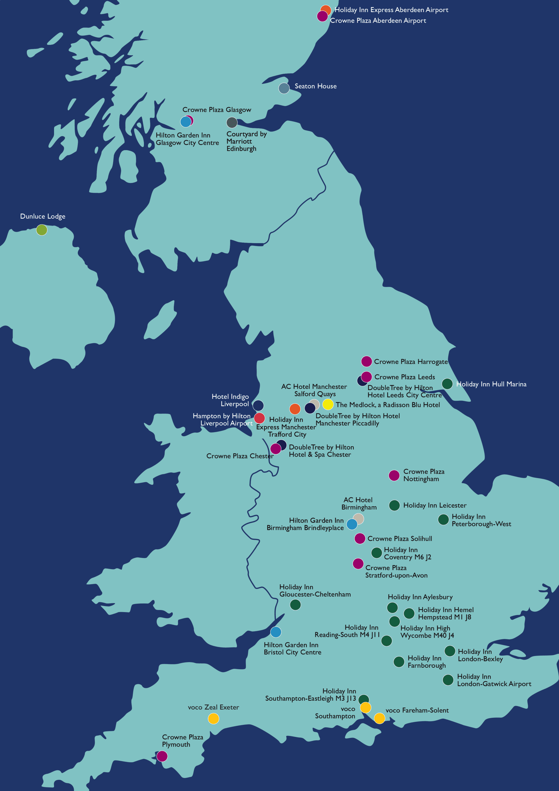 | Hotel | Bedrooms | Leisure Facilities | Restaurants & Bars | Car Parking Spaces | Coach Parking | Nearest Train Station & Distance | Nearest Airport & Distance | Closest Tourist Attractions |